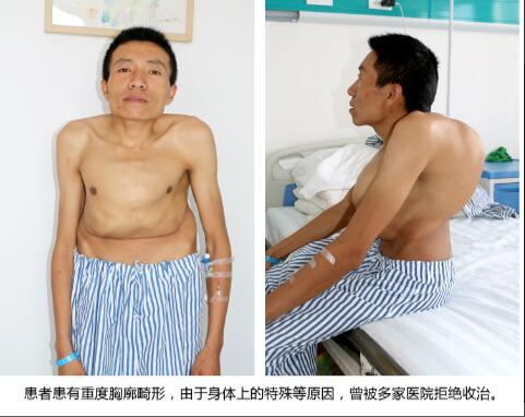 主诊医生丁德刚主任,在先进眼看到胡这志时,就明显感到这位患者的特殊——这位年近40岁的中年男子,由于身体重度畸形,身高只有130厘米左右,前胸整体严重突出,基本与面部垂直持平;背部左侧畸形,骨骼高出背部平面近30厘米。