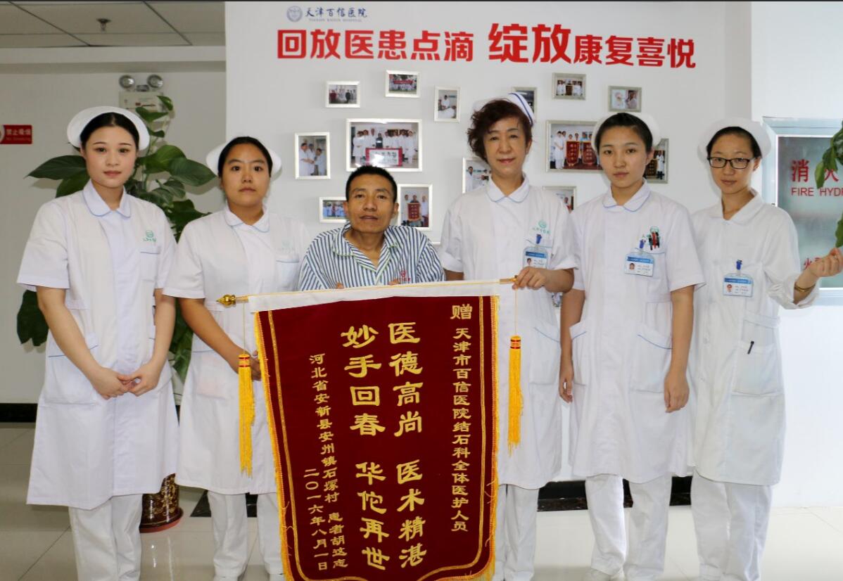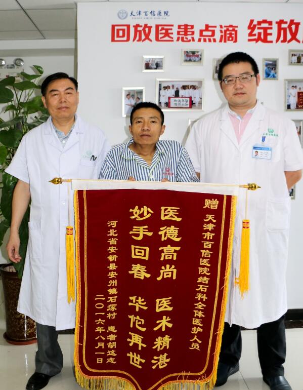 故事还要从6月26日说起。这天胡这志跟随爱人,从河北老家一路乘火车赶往天津,就为了一条连他也不敢肯定的信息:“天津百信医院专业治疗结石病,效果值得信赖!”这条网友发布的留言,仿佛使他从绝望的深渊中望到了一丝光亮。这时的胡这志,已经走过近一个月的求医之路。连续发烧多日,严重腰痛,并伴有血尿等症状,以“身体严重畸形”、“不适宜手术”等理由被多家医院拒之门外的他,已经被病痛折磨的愈发憔悴。